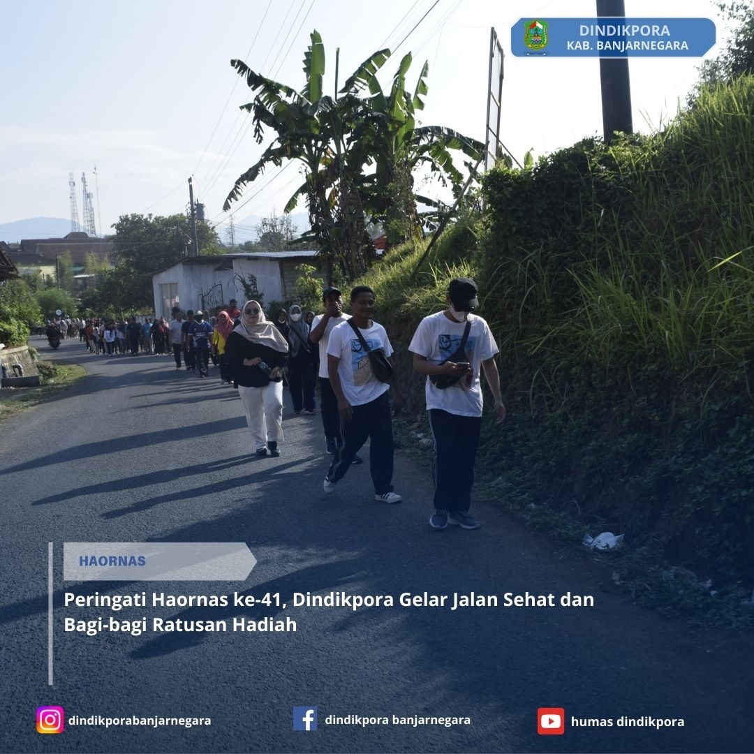 Sobat Dindikpora, dalam rangka memperingati Hari Olahraga Nasional (Haornas) ke-41, Dinas Pendidikan, Kepemudaan, dan Olahraga Kabupaten Banjarnegara mengadakan kegiatan Jalan Sehat pada Jumat (6/9/2024). Acara ini diikuti oleh seluruh karyawan dan staf, dengan rute yang cukup seru sepanjang 3 kilometer. Mulainya dari kantor Dindikpora, menuju Kantor Kodim 0704 ke arah selatan, kemudian melewati Irigasi, lanjut ke belakang Mapolres Banjarnegara, dan kembali lagi ke kantor.