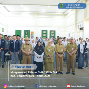 Banjarnegara-Dalam rangka meningkatkan kemampuan berorganisasi dan melatih jiwa kepemimpinan di gelar Musyawarah Pelajar SMA/ SMK/ MA Kab. Banjarnegara pada Senin ( 9/07/2024 )kegiatan Ini mengangkat tema &doublequote; Student Deliberation Leadership Project “ Bertempat di Aula lantai 3 Gedung Dinas Pendidikan Kepemudaan dan Olahraga Kab. Banjarnegara.