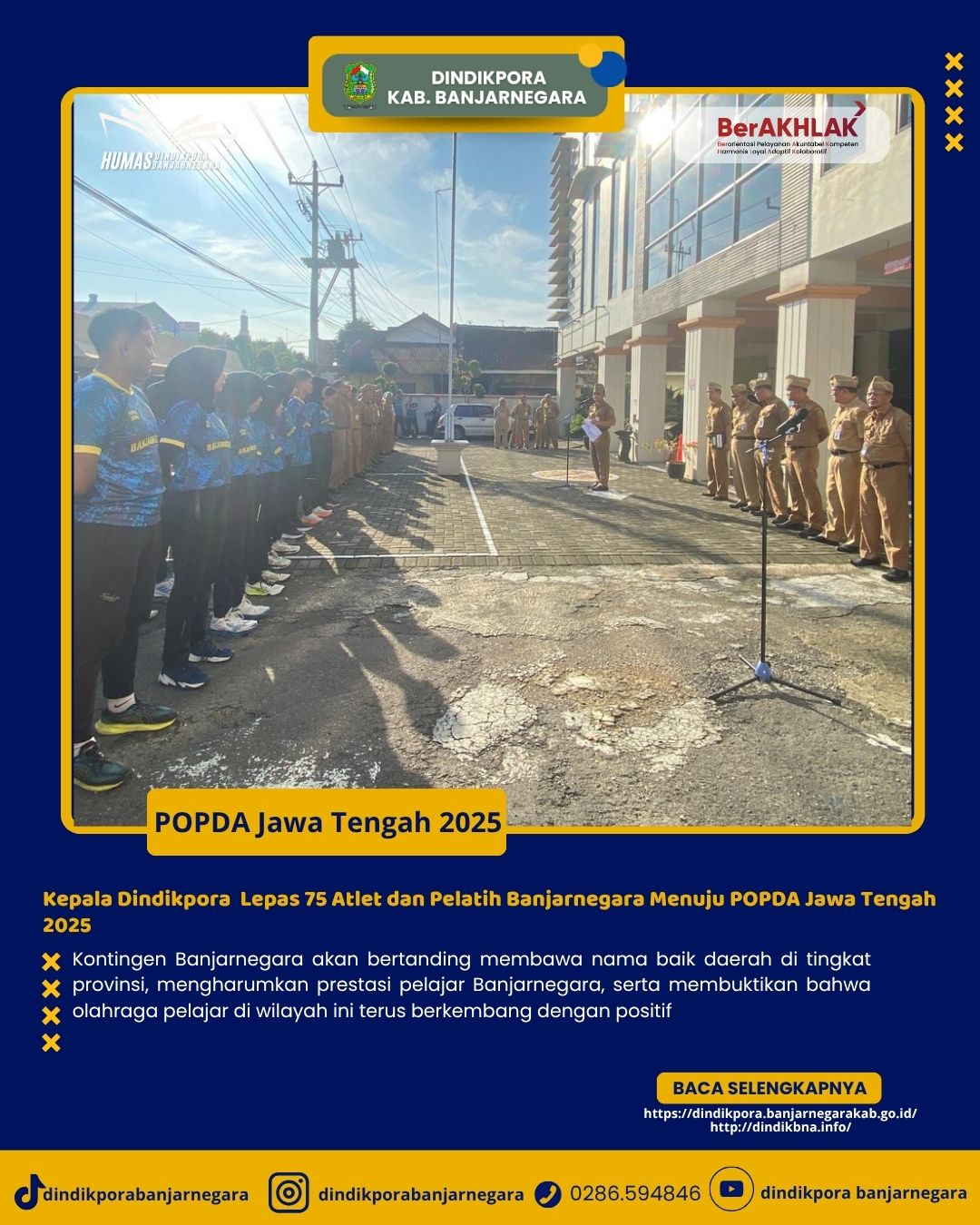 Banjarnegara – Sebanyak 75 atlet dan pelatih dari berbagai cabang olahraga dilepas secara resmi oleh Kepala Dinas Pendidikan, Kepemudaan, dan Olahraga (Dindikpora) Kabupaten Banjarnegara untuk mengikuti Pekan Olahraga Pelajar Daerah (POPDA) jenjang SMA/SMK/MA tingkat Provinsi Jawa Tengah tahun 2025.