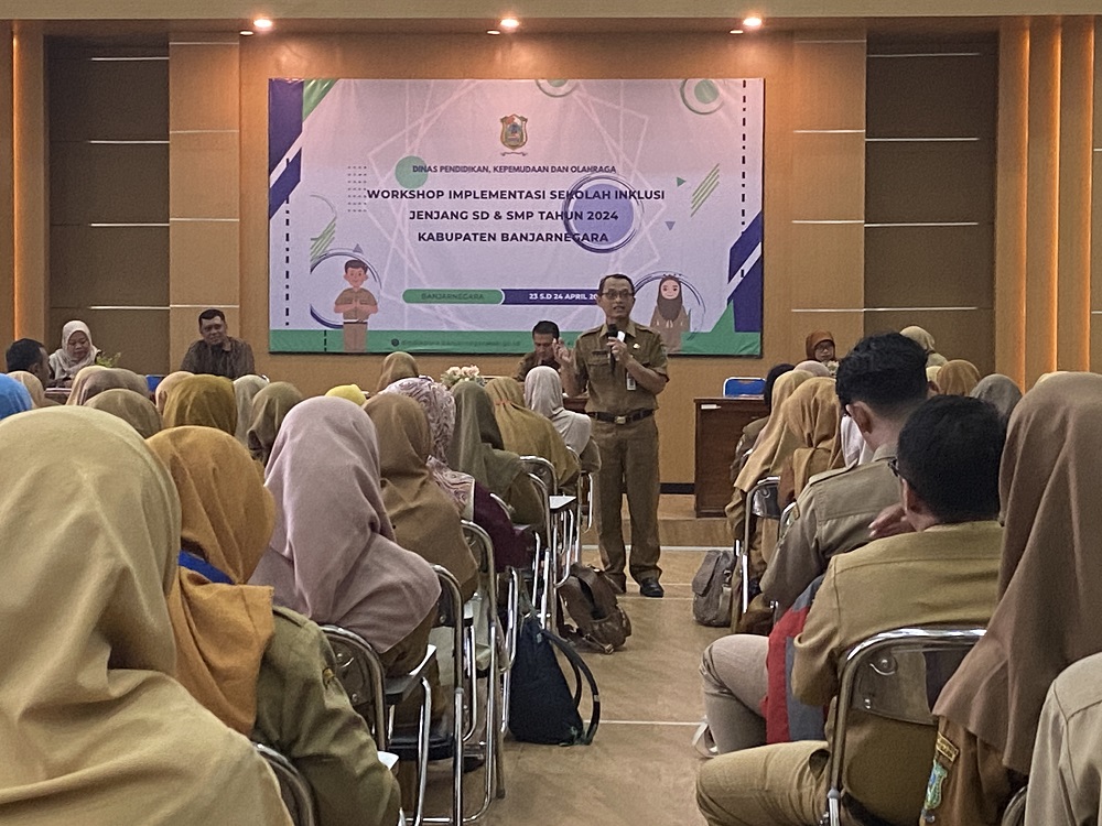 Banjarnegara - Pendidikan inklusif adalah sistem penyelenggaraan pendidikan yang memberikan kesempatan kepada semua peserta didik yang memiliki kelainan dan memiliki kecerdasan/bakat istimewa untuk mengikuti pendidikan secara bersama-sama dengan peserta didik pada umumnya. Pendidikan inklusif dapat memberikan suasana lingkungan belajar yang ramah, kondusif dan anti-diskriminasi. Dalam rangka meningkatkan kemampuan para pendidik baik negeri ataupun swasta untuk memberikan pembelajaran pada anak anak berkebutuhan khusus di selenggarakan Workshop Impelementasi Sekolah Inklusi Jenjang SD dan SMP Tahun 2024 yang berlangsung selama dua hari pada 23-24 April 2024 di Aula gedung Dindikpora Banjarnegara.