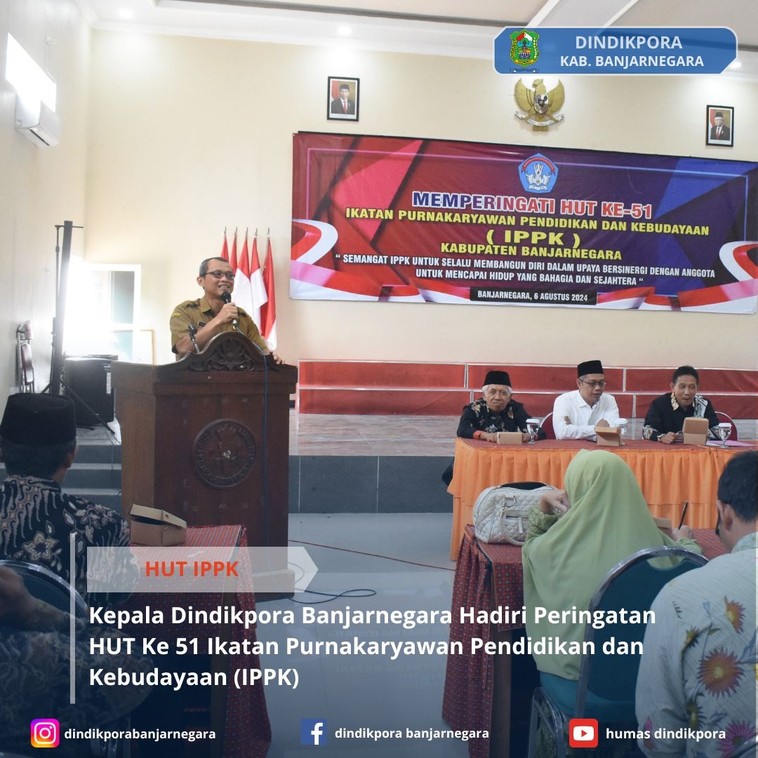 Kepala Dindikpora Banjarnegara Teguh Handoko, S.Sos.,hadir dalam peringatan hari jadi Ikatan Purnakaryawan Pendidikan dan Kebudayaan (IPPK) yang dilaksanan pada Selasa, 6 Agustus 2024 di Gedung PGRI Kabupaten Banjarnegara.
