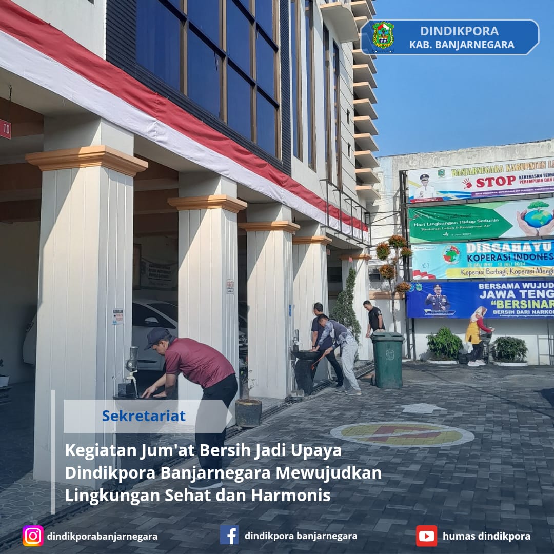 Banjarnegara – Dinas Pendidikan, Kepemudaan, dan Olahraga (Dindikpora) Kabupaten Banjarnegara menggelar kegiatan Jum&singlequote;at Bersih pada Jumat, 2 Agustus 2024. Kegiatan ini dimulai pukul 08.00 WIB, segera setelah apel pagi selesai, dengan tujuan menciptakan lingkungan yang sehat dan nyaman bagi seluruh pegawai serta masyarakat yang berkunjung.