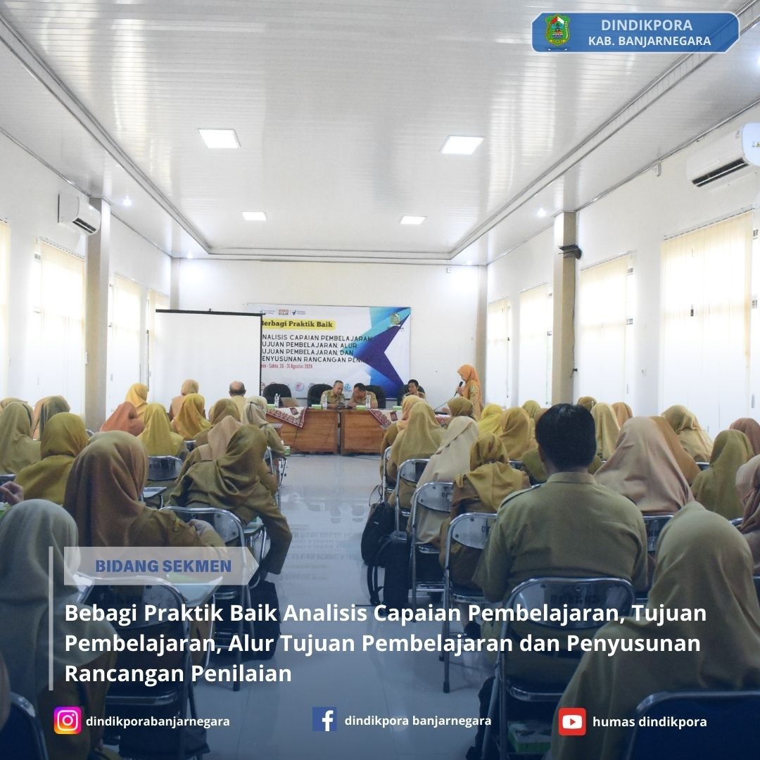 Sebanyak 79 Guru Bahasa Indonesia SMP se-Banjarnegara ikuti Workshop Berbagi Praktik Baik MGMP 2024. Workshop ini berfokus pada Analisis Capaian Pembelajaran, Tujuan Pembelajaran, Alur Tujuan Pembelajaran, dan Penyusunan Rancangan Penilaian. Workshop dilaksanakan di Aula Diponegoro, Dindikpora Banjarnegara pada Senin, 26 Agustus 2024. Workshop Berbagi Praktik Baik bertujuan untuk mendorong gerak cepat guru dalam menyesuaikan kurikulum pembelajaran.