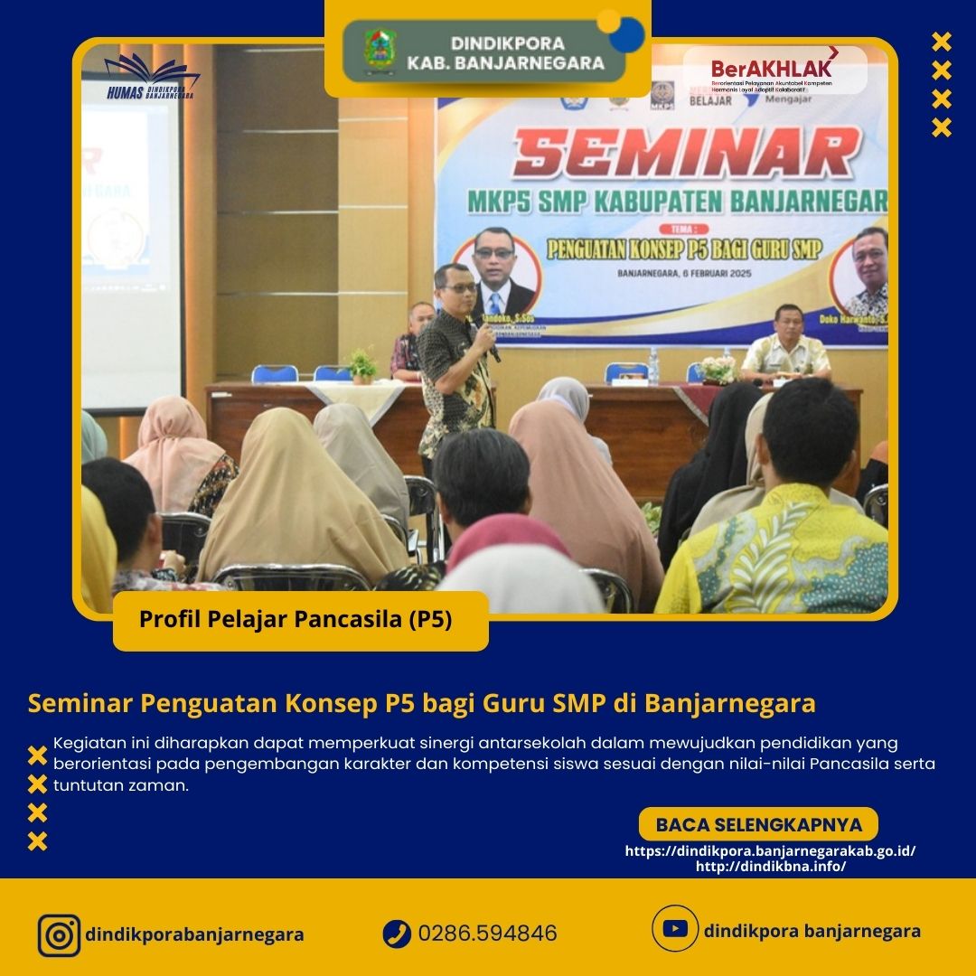 Sebagai upaya memperkuat pemahaman dan implementasi P5 di tingkat satuan pendidikan, Musyawarah Kerja Kepala Sekolah (MKKS) SMP Kabupaten Banjarnegara menggelar seminar bertema &doublequote;Penguatan Konsep P5 bagi Guru SMP&doublequote;. Kegiatan ini berlangsung pada Kamis (06/02/2025) di aula lantai 3 Dinas Pendidikan, Kepemudaan, dan Olahraga (Dindikpora) Kabupaten Banjarnegara.