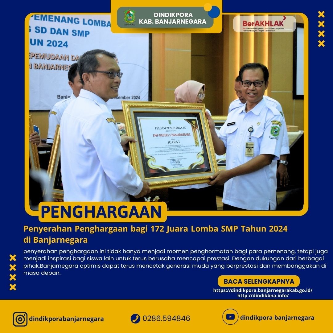 Banjarnegara – Sebanyak 172 siswa berprestasi jenjang SMP di Kabupaten Banjarnegara menerima penghargaan atas keberhasilan mereka dalam berbagai ajang perlombaan di tingkat provinsi dan nasional. Penyerahan penghargaan ini dilakukan oleh Kepala Dinas Pendidikan, Kepemudaan, dan Olahraga (Dindikpora) Banjarnegara, Teguh Handoko, S.Sos., dalam acara yang berlangsung meriah.