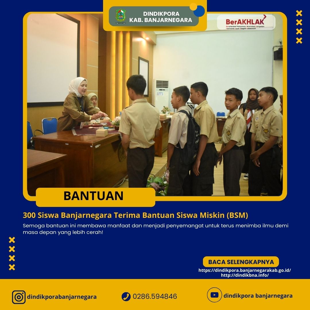 Banjarnegara – Sebanyak 300 siswa dari SMP negeri dan swasta di Kabupaten Banjarnegara menerima Bantuan Siswa Miskin (BSM) yang disalurkan pada Jumat, 20 Desember 2024. Acara ini berlangsung di Gedung Lantai 3 Dinas Pendidikan, Kepemudaan, dan Olahraga (Dindikpora) Banjarnegara, dengan penyaluran bantuan dilakukan oleh Bank Jateng dan disaksikan oleh operator BSM.