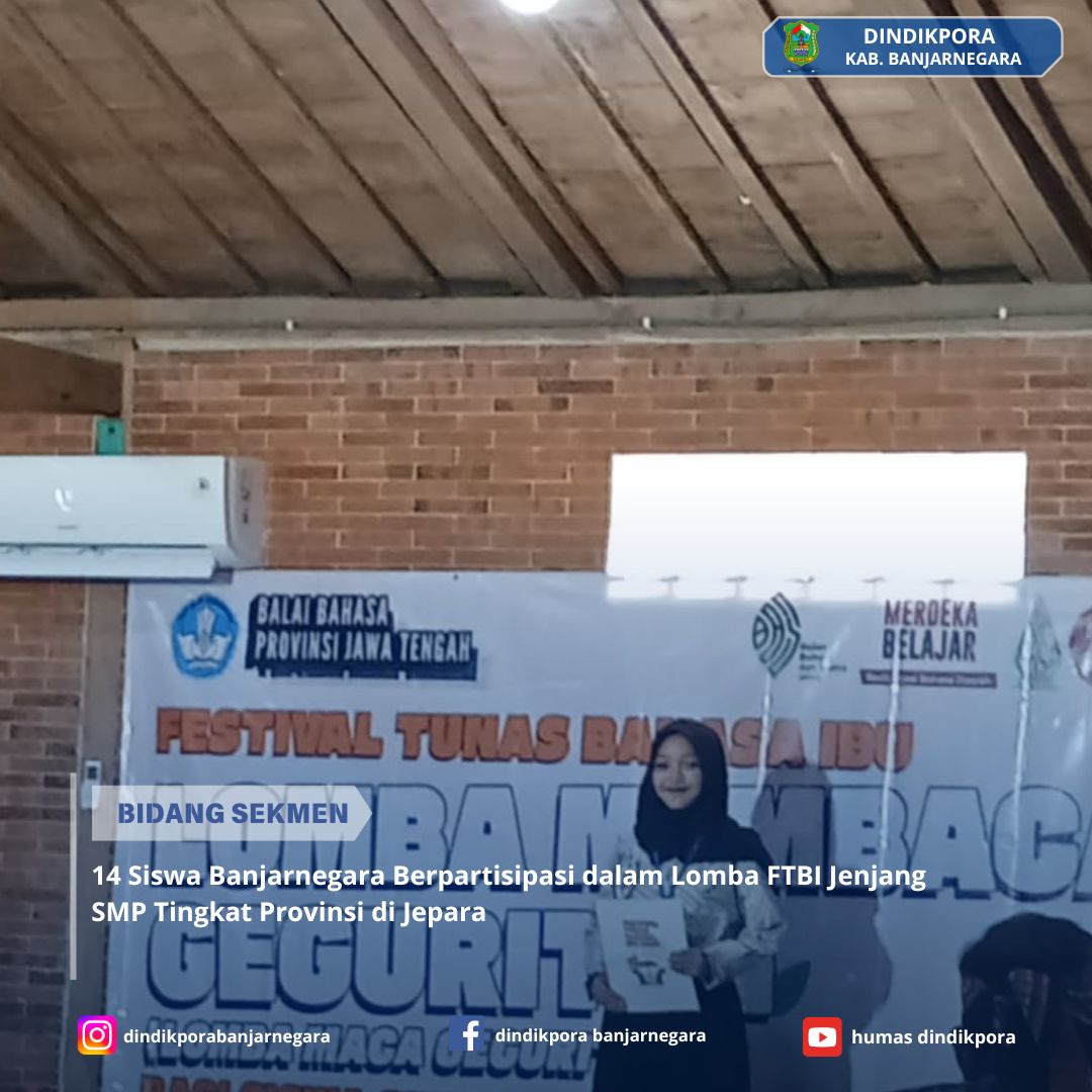 Jepara, Oktober 2024 – Kabupaten Banjarnegara kembali menorehkan prestasi membanggakan di ajang Festival Tunas Bahasa Ibu (FTBI) Tingkat Provinsi Jawa Tengah 2024 untuk jenjang Sekolah Menengah Pertama (SMP). Festival yang berlangsung di Jepara ini sukses digelar oleh Balai Bahasa Provinsi Jawa Tengah, diikuti oleh ratusan siswa dari berbagai kabupaten dan kota di seluruh provinsi.