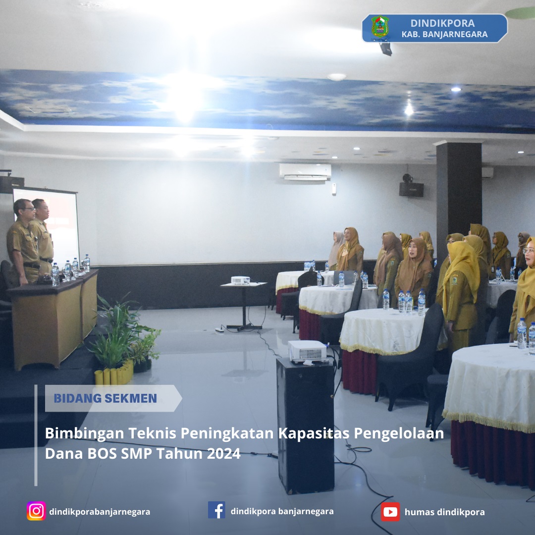 Banjarnegara – Dalam rangka memberikan bekal dan penguatan kepada bendahara sekolah agar pengelolaan dana BOS SMP sesuai dengan petunjuk dan aturan yang berlaku, Dinas Pendidikan, Kepemudaan, dan Olahraga Kabupaten Banjarnegara melalui Bidang Sekolah Menengah mengadakan Bimbingan Teknis (Bimtek) Peningkatan Kapasitas Pengelolaan Dana BOS SMP tahun 2024.