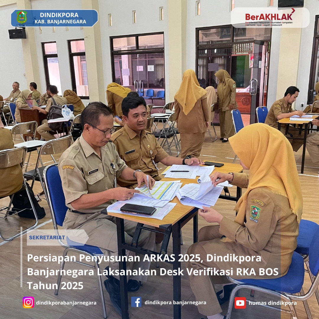 Banjarnegara – Dalam rangka persiapan penyusunan ARKAS 2025, Dinas Pendidikan, Kepemudaan, dan Olahraga (Dindikpora) Kabupaten Banjarnegara melaksanakan Desk Verifikasi RKA BOS Tahun 2025. Kegiatan ini berlangsung pada Selasa (22/10/2024) di aula lantai 3 gedung Dindikpora, dengan diikuti oleh 100 bendahara BOS jenjang SMP dari berbagai sekolah di Banjarnegara.