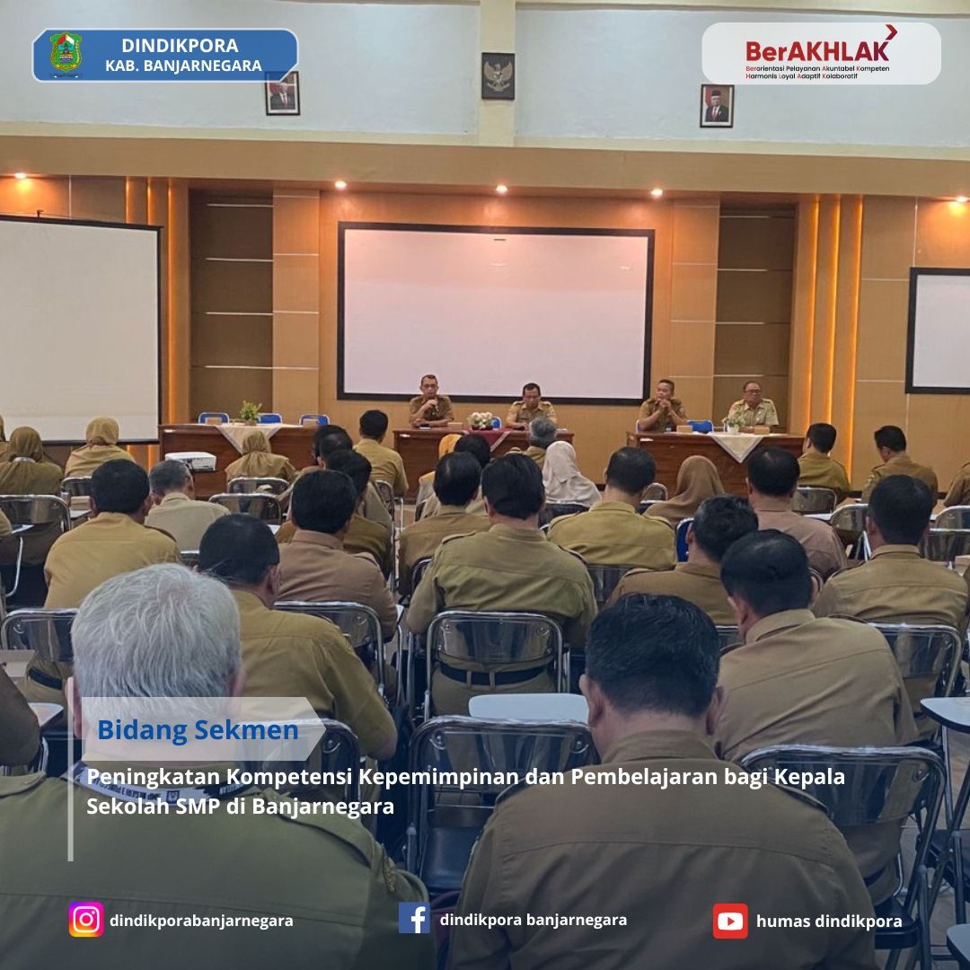 Banjarnegara – Dinas Pendidikan, Kepemudaan, dan Olahraga (Dindikpora) Kabupaten Banjarnegara melalui bidang Sekmen menggelar pelatihan peningkatan kompetensi kepemimpinan dan pembelajaran bagi 100 kepala sekolah SMP di seluruh Banjarnegara. Kegiatan ini berlangsung selama dua hari, mulai 29 hingga 30 Oktober, dan bertujuan untuk memperkuat peran kepala sekolah dalam membentuk siswa yang tidak hanya cerdas secara akademis tetapi juga berkarakter baik.