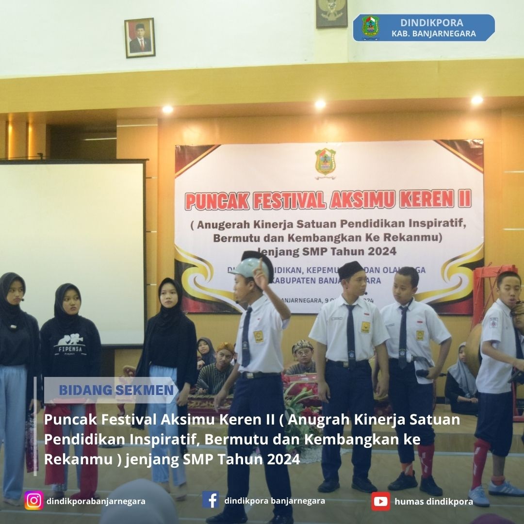 Banjarnegara – Dinas Pendidikan, Kepemudaan, dan Olahraga Kabupaten Banjarnegara sukses melaksanakan acara Anugerah Kinerja Satuan Pendidikan Inspiratif, Bermutu, dan Kembangkan ke Rekanmu (Aksimu Keren) untuk jenjang SMP tahun 2024, pada Rabu (09/10/2024). Acara ini berlangsung di Aula lantai 3 Gedung Dindikpora Banjarnegara.