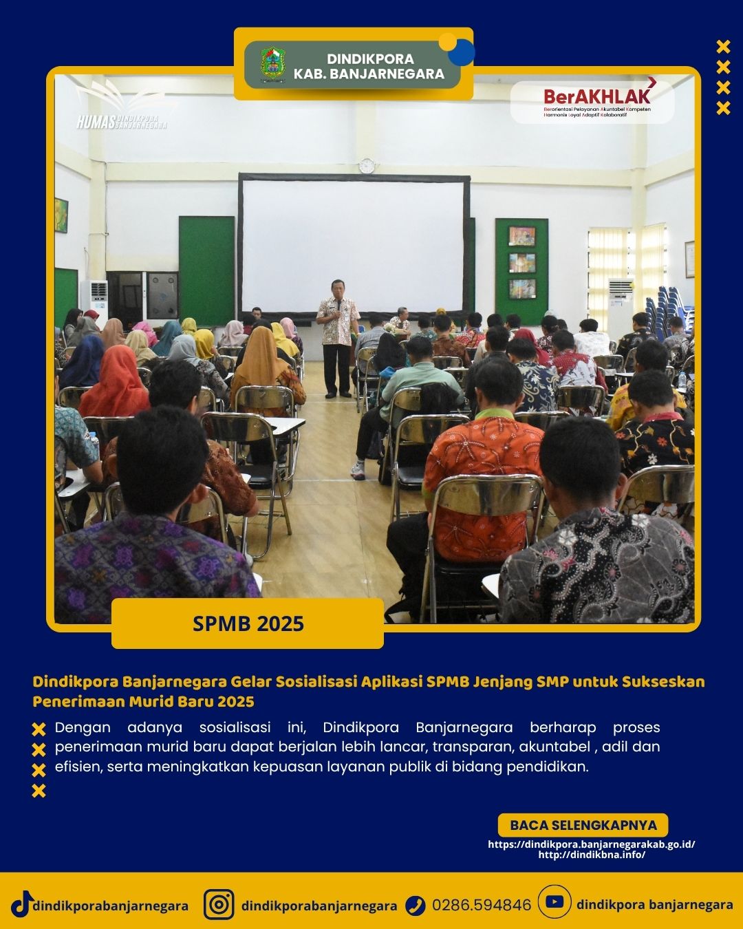 Banjarnegara – Dalam rangka mematangkan persiapan serta menyukseskan pelaksanaan Sistem Penerimaan Murid Baru (SPMB) jenjang Sekolah Menengah Pertama (SMP), Dinas Pendidikan, Kepemudaan dan Olahraga (Dindikpora) Kabupaten Banjarnegara melalui Bidang Sekolah Menengah menggelar kegiatan Sosialisasi Aplikasi SPMB pada Kamis, 19 Juni 2025.