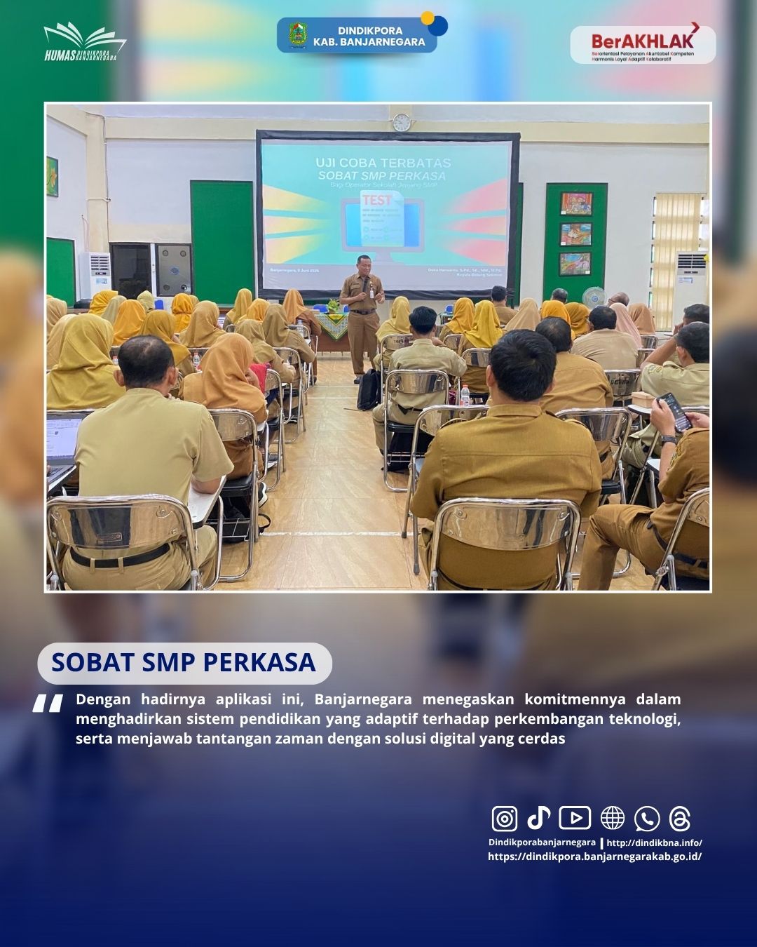 Sosialisasi tersebut diikuti oleh 100 operator sekolah dari SMP negeri dan swasta se-Kabupaten Banjarnegara. Para operator sekolah memiliki peran penting dalam mendukung kelancaran pelaksanaan TKA, khususnya dalam pengelolaan data, sistem aplikasi, serta koordinasi teknis di…